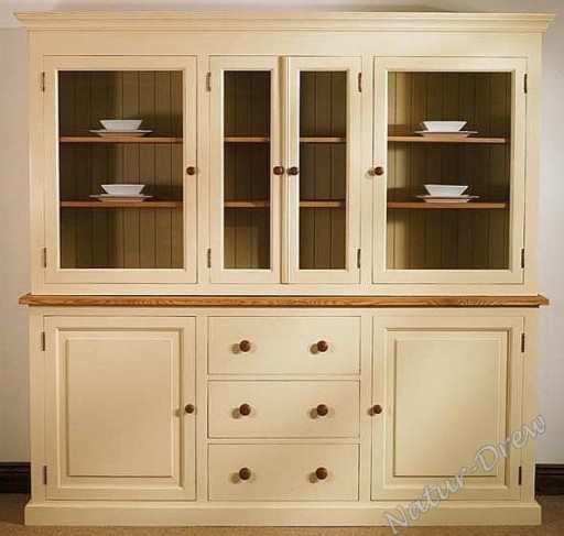 - Kredens Drewniany Składa się z dwóch części -nadstawki i komody oddzielonej od siebie blatem.Nadstawka Kredensu posiada pięć małych szuflady oraz dwoje przeszklonych drzwiczek ,natomiast pod blatem znajdują sie trzy funkcjonalne szuflady wysuwane na rolkowych prowadnicach ,a pod nimi zamykane szafki.Całość wzbogacają zawiasy imitujące stare złoto i ręcznie robione gałki
