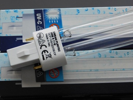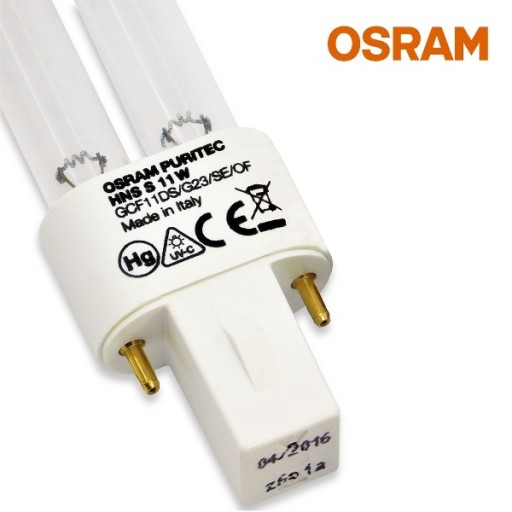 Promiennik nadfioletu Osram Puritec HNS G23 o mocy 11W, o wyglądzie świetlówki kompaktowej, z 2-pinowym trzonkiem G23.