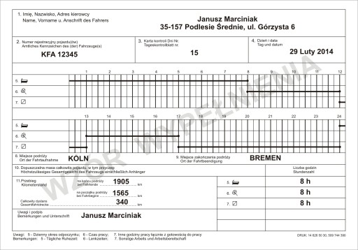 Książka kontrolna czasu pracy kierowcy (Kontrollbuch) wymagana jest przy kierowaniu pojazdami ciężarowymi o masie całkowitej od 2,8 do 3,5t. Jest to zbiór dziennych arkuszy kontrolnych. Na ostatniej stronie (okładki) mają Państwo przykładowe wypełnienie książeczki.