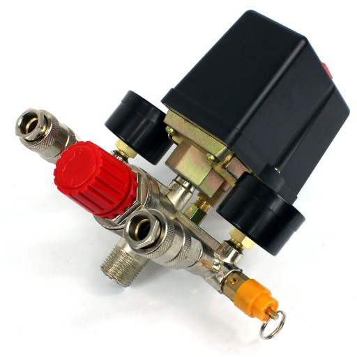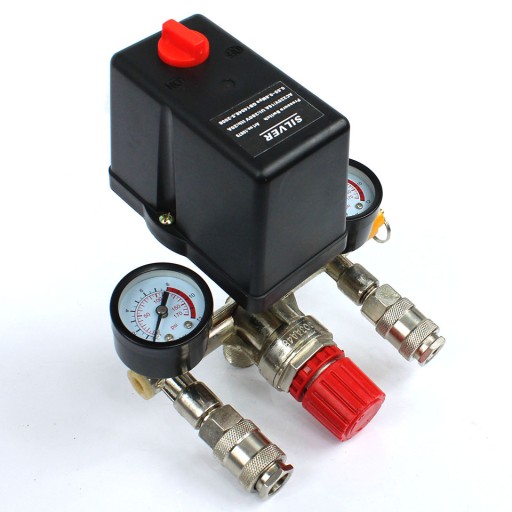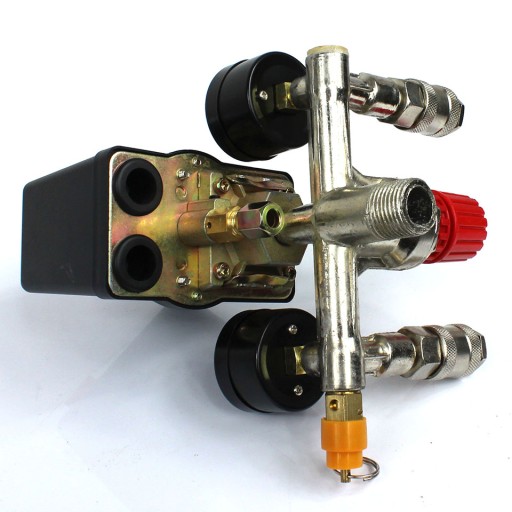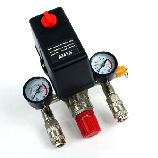 Wysokiej jakości wyłącznik ciśnieniowy (presostat) z kolektorem, dwoma szybkozłączkami i manometrami przeznaczony do kompresorów ciśnieniowych na 230V i 380V.