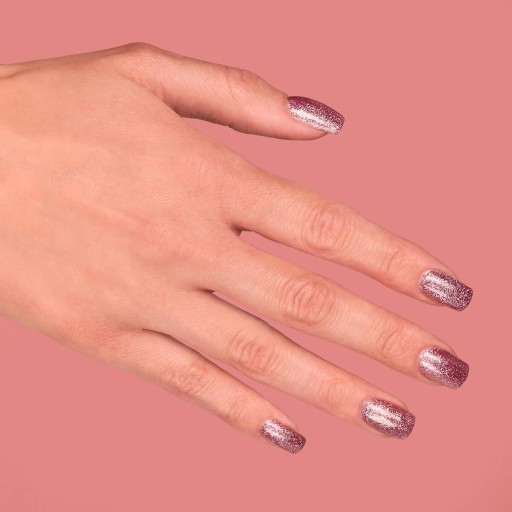 To mieszanka srebrnej i czerwonej drobinki, która tworzy efekt opalizującego ciemno-różowego złota.