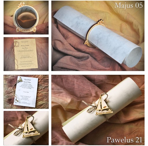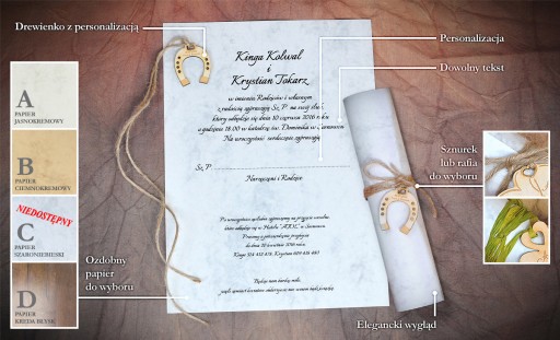 Komponuj samodzielnie zaproszenie dobierając papier i wzór dowolnie: np. wzór Majus_08, kolor papieru D, rafia. Jeżeli nie dokonasz wyboru, zaproszenie realizujemy jak na zdjęciu głównym. Zamiennie zamiast papieru C stosujemy domyślnie papier A. Pamiętaj aby wypełnić i wysłać formularz - to bardzo przyspiesza realizację zlecenia.