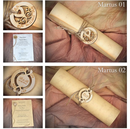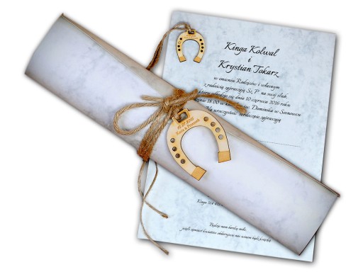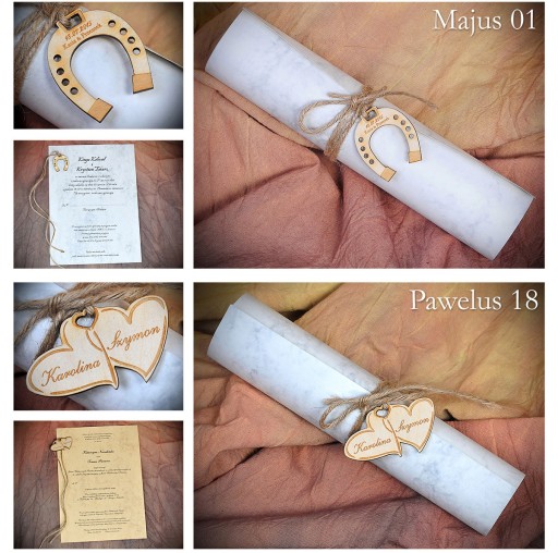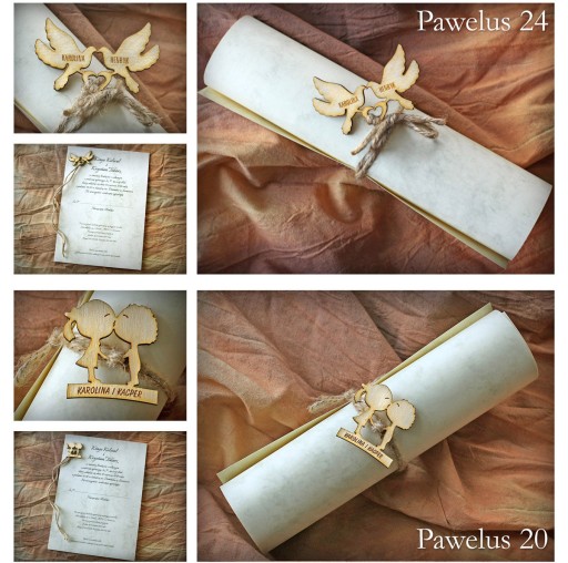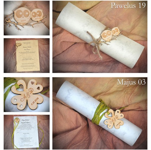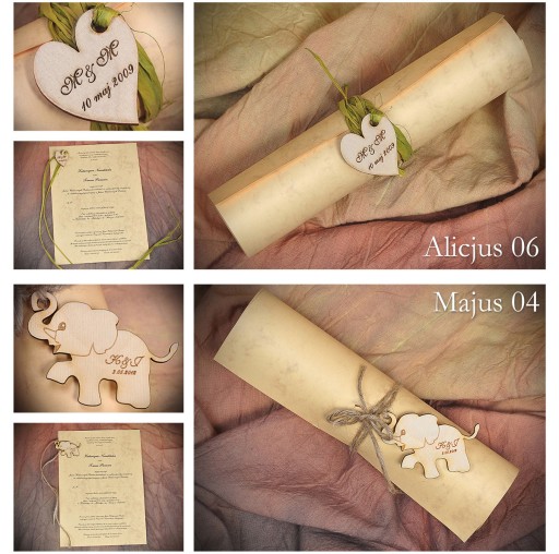 Przedmiotem aukcji próbka zaproszenia ślubnego Cena zawiera wykonanie ozdobnego elementu do zaproszeń z drewna o grubości 3 mm z wygrawerowanymi inicjałami oraz datą ślubu oraz wydruk treści na ozdobnym papierze marble 220g w formacie A4 lub kredzie 200g zadrukowanej imitacją struktury drewna. Jeżeli chcesz zamówić gotowe zaproszenie ślubne prosimy zamówić na osobnej aukcji PROJEKT!