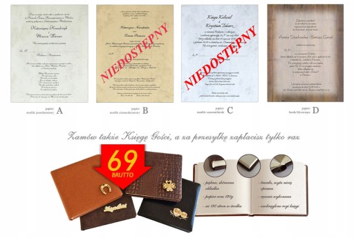 - Pamiętaj aby wraz z zaproszeniami zamówić pudełka, księgę gości i winietki na stoły weselne.