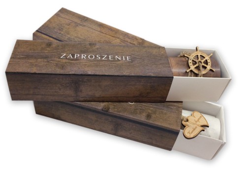 Do zaproszeń z Kolekcji WoodArt posiadamy pięknie pasujące pudełka z napisem zaproszenie. Zapraszamy do zakupu zaproszeń w pakiecie wraz z pudełkami i księgą gości - otrzymają Państwo wówczas atrakcyjny rabat.