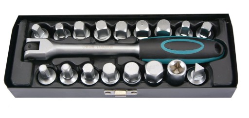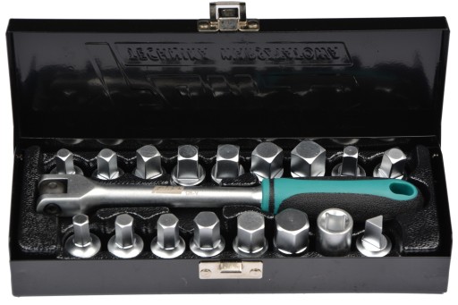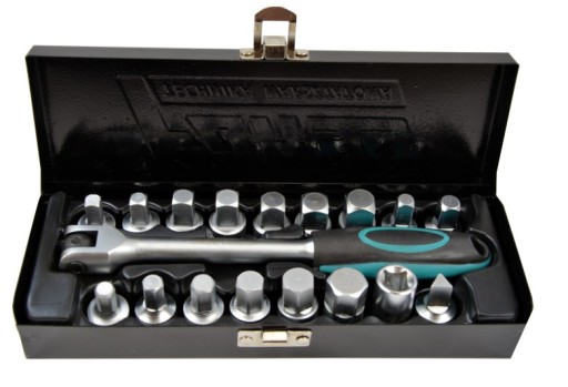 Klucze wykonane są z mocnej stali chromowo-wanadowej. Dzięki zastosowaniu najpopularniejszych końcówek zestaw jest bardzo praktyczny i z całą pewnością przyda się w każdym warsztacie samochodowym. W komplecie znajduje się pokrętło z przegubem na 3/8" zakończone rękojeścią.