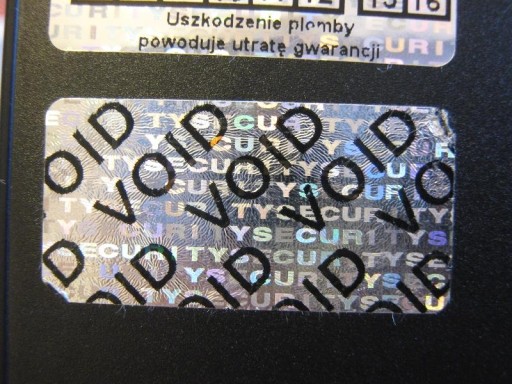 Sposób zabezpieczenia: Po odklejeniu na powierzchni pojawia się napis VOID.