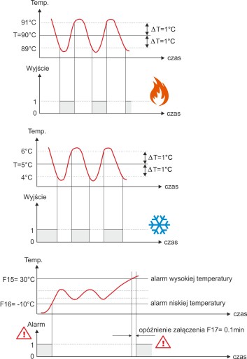 Regulator służy do utrzymywanie temperatury T z zadaną histerezą T w urządzeniach chłodniczych lub grzewczych. Sterowanie elementem wykonawczym odbywa się przez wyjście przekaźnikowe, zaś pomiar temperatury dokonywany jest przy pomocy czujnika temperatury. Zasada działania regulacji temperatury przy grzaniu (rys.1) i chłodzeniu (rys. 2) .