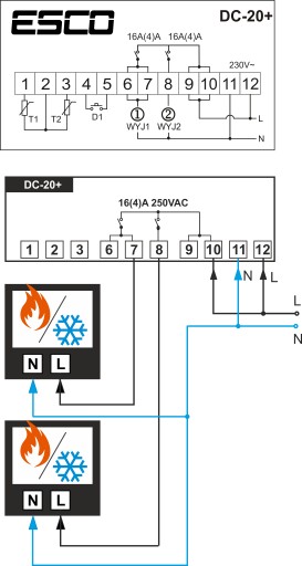 DC-20 z ang. skrótu "double controller" to de facto dwa REGULATORY temperatury umieszczone w jednej obudowie z możliwością dowolnej konfiguracji wejść-wyjść i powiązania obu regulatorów. Urządzenie ma 2 wejścia oraz 2 wyjścia sterujące, które mogą pracować w trybie GRZANIE lub CHŁODZENIE, a pomiar mierzony jest z czujnika T1 lub T2, albo z obu czujników jednocześnie.