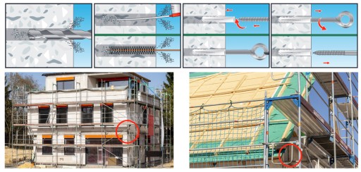 - wysokie bezpieczeństwo mocowania rusztowań, gwarantowane przez optymalnie dobrany do tych celów wkręt Ø12mm i dybel Ø14mm,