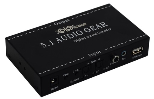Pracuje bez komputera. Dekoder dźwięku XOLORSpace ® zamienia sygnał cyfrowy SPDIFF Toslink lub Coaxial na sygnał analogowy 5.1 Pozwala to na dekodowanie cyfrowego formatu audio (od odtwarzacza BlueRay, telewizora, konsoli do gier itp) do starszego systemu analogowego 5.1 Do dekodera XOLORSPace ® można podłączyć do 4 urządzeń źródłowych ( poprzez 2x Toslink, 1x koncentryczny, 1x wejście mini jack). Dekoder XOLORSpace ® obsługuje najnowsze formaty audio, a Konwersja cyfrowo-analogowa jest na bardzo wysokim poziomie 24bit / 192 kHz. Wszystkie popularne formaty audio dekoder rozpoznaje automatycznie. Wyjście to 6x RCA i 3x minijack, które działają równocześnie. Dodatkowo do złącza USB można podłączyć pamięć USB.