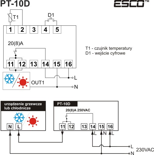 Regulator posiada cyfrowy odczyt temperatury oraz funkcję kalibracji wskazań. Zastosowano metodę regulacji załącz/wyłącz (ON-OFF) z regulowaną histerezą. Regulator wyposażony jest w wyjście regulacyjne przekaźnikowe dużej mocy 20A (maksymalne obciążenie rezystancyjne 4500W). Tryb pracy: "grzanie" lub "chłodzenie" ustawia się menu. Montaż w rozdzielni elektrycznej na szynę DIN TH-35.