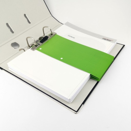 - rozmieszczenie otworów pozwala na wpinanie przekładek do segregatorów o wymiarach dostosowanych do formatów od A5 do A4 w pozycji pionowej i poziomej