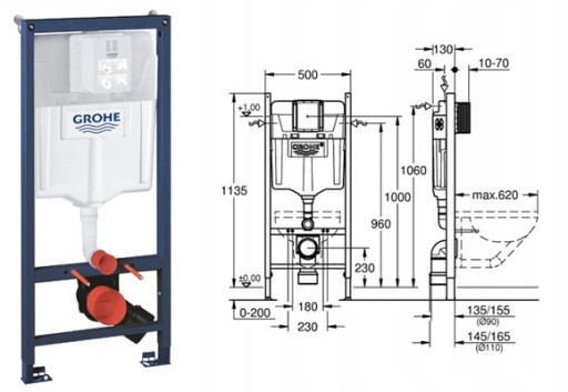 Stelaż podtynkowy Grohe do montażu przyściennego lub montażu w ścianie szkieletowej. Przeznaczony do mis WC wiszących o rozstawie otworów montażowych 18cm lub 23cm.