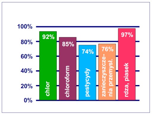 - redukuje chlor, pestycydy, chloroform i rozpuszczalniki przemysłowe