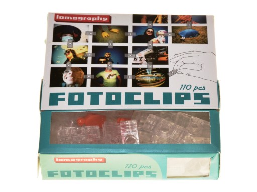 Klipsy do łączenia zdjęć produkowane przez firmę Lomography. W pudełku znajduje się 110 sztuk małych przezroczystych oraz pomarańczowych łączeń - sposób użycia na kartonowym pudełku produktu.