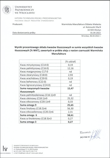 Przeprowadzone badania w laboratorium Uniwersytetu Przyrodniczego we Wrocławiu pozwoliły nam udokumentować najwyższą jakość naszego oleju z czarnuszki.