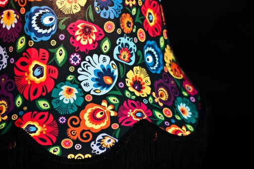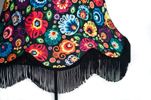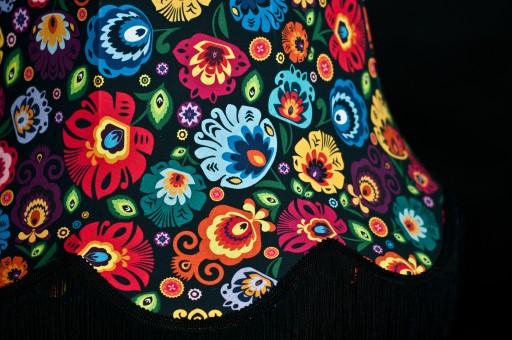 Styl łowicki to motywy ludowe, które zachwycają bogactwem kolorów. Abażury z tej kolekcji ozdobione są pięknymi dodatkami pasmanteryjnymi w postaci taśm i długich frędzli.