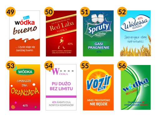 Przedmiotem aukcji jest zestaw 6 naklejek na wódkę, do wyboru w obrębie z dostępnych wzorów.