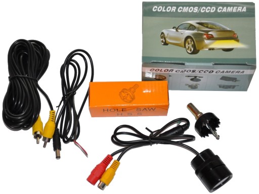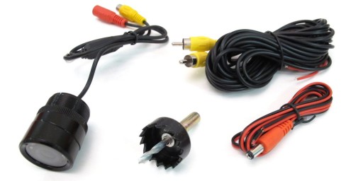 Kamera cofania - obraz w kolorze Przewód AV typu cinch RCA 5m dł Przewód zasilający 101cm długości Instrukcje montażu w języku Polskim Wiertło z otwornicą do wykonania otworu montażowego w np zderzaku samochodu lub tylnej klapie