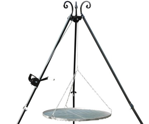 Kołowrotek posiada wygodną drewnianą rączkę, zapadka gwarantuję płynną oraz łatwą regulację wysokości rusztu nad ogniskiem