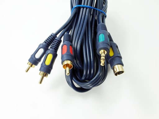 Przewód 3 wtyki RCA (chinch) na wtyk S-Video (svhs) + wtyk mini jack 3,5mm stereo.