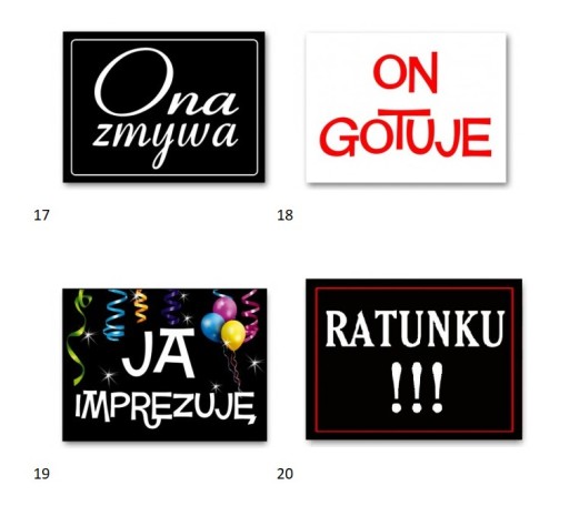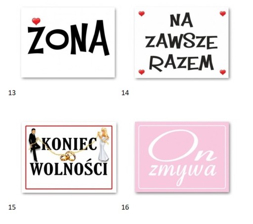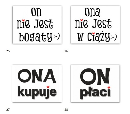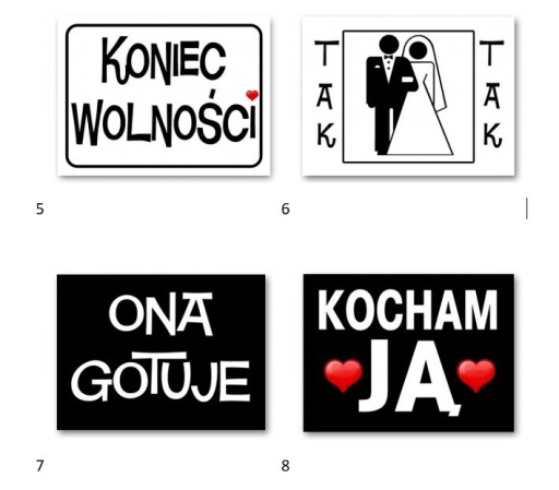 Zabawne naklejki samoprzylepne na podeszwy butów Młodej Pary. Profesjonalny druk offsetowy gwarantuje, że nadruk nie rozmaże się pod wpływem wilgoci. Komplet zawiera 2 szuki takich samych naklejek. Orientacyjny rozmiar jednej naklejki: 3,7 cm x 2,8 cm. Mnóstwo różnych kombinacji np. na podeszwach Panny Młodej "Ona gotuje", a u Pana Młodego "Ja imprezuję".