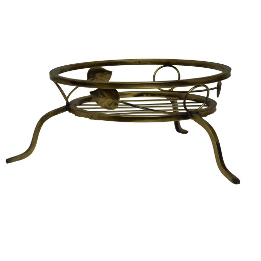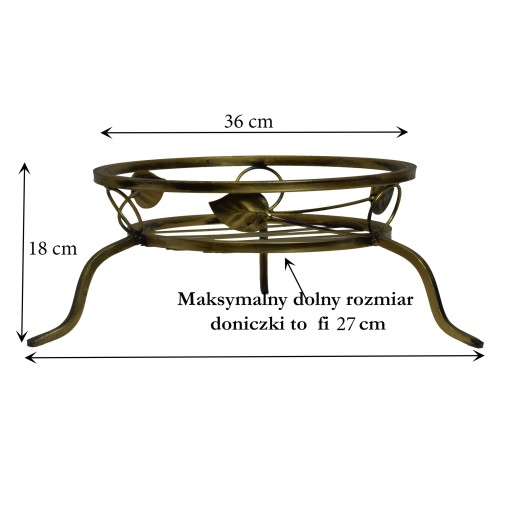 Polskiej produkcji, stabilny, solidnie wykonany z metalu w kolorze złotej patyny, mimo swoim niedużym wymiarom posiada dużą i solidną podstawę na donice o rozmiarach maksymalnie fi 27 cm co pozwala na postawienie ciężkiej donicy, jest praktyczny jako stojak na kwiaty, jak i dzięki perfekcyjnie wykonanym detalom zdobi i upiększa każde wnętrze oraz taras. Całkowite wymiary to: