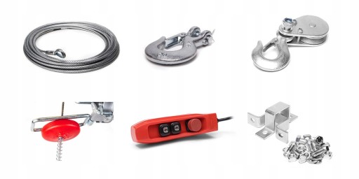 - W zestawie wyciągarka, pilot sterujący, zblocze hakowe, instrukcja, gwarancja, śruby, uchwyty montażowe