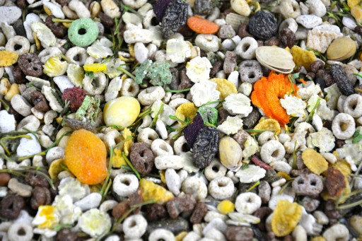 ekstrudat: jęczmień, kukurydza, chrupki kukurydziane i pszeniczne, produkty pochodzenia piekarniczego, kandyzowane owoce, czips ziemniaczany