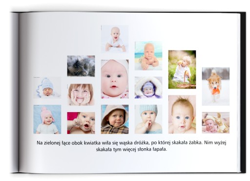 Jeśli mamy do opowiedzenia bardzo dużo, możemy na stronie nie umieszczać zdjęć a jedynie sam tekst. Przykładowo na lewych stronach opowiadamy naszą historię a na prawych wstawiamy zdjęcia.