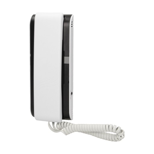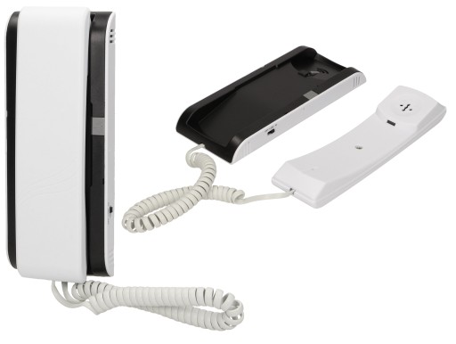 - wyposażony w jeden przycisk funkcyjny do otwierania drzwi wejściowych umieszczony na podstawie obok słuchawki