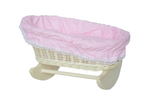 Śliczna i solidnie wykonana wiklinowa kołyska dla lalek z wyściółką w kolorze: różowa krateczka.