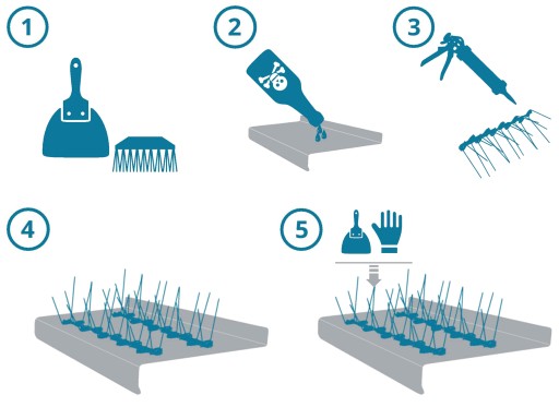 Kolce na gołębie montuje się za pomocą specjalnego kleju silikonowego lub za pomocą wkrętów w miejscach widocznych dla ptaków.