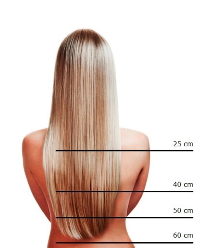 Zdjęcie obok przedstawia dokąd sięgają sprzedawane przez nas włosy o długościach 25 cm, 40 cm, 50 cm i 60 cm. Podane porównanie zostało przygotowane dla osoby o wzroście 165 cm.
