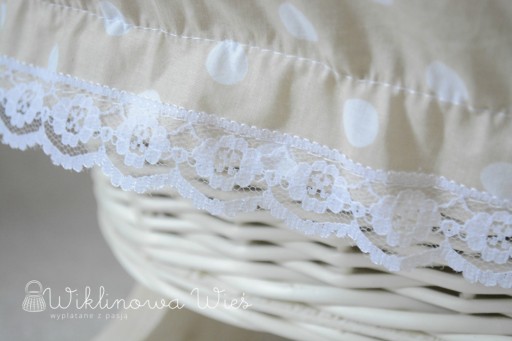 PREMIUM Komplet wiklinowy : wózek dla lalek + kołyska z beżową wyściółką w białe groszki.