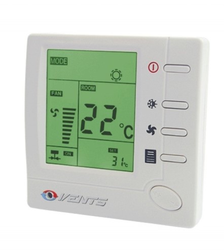 W obudowie panelu wykonanego z plastiku jest wbudowany czujnik temperatury. Na frontowej płycie pulpitu znajduje się wyświetlacz LCD z podświetleniem przycisku sterowania. Wyświetlacz wskazuje obecną oraz ustawioną temperaturę powietrza w pomieszczeniu, wybrany system (ochłodzenie, nagrzewanie) lub automatyczne ustawioną prędkość wentylatora. Prędkość wentylatora można ustawić ręcznie za pomocą przycisków sterowania. Istnieje możliwość sterowania trzema prędkościami (szybko, średnio/wolno) automatycznie w zależności od temperatury w pomieszczeniu.