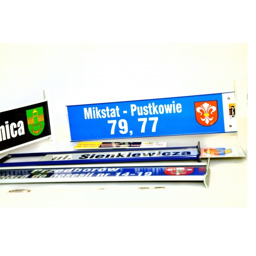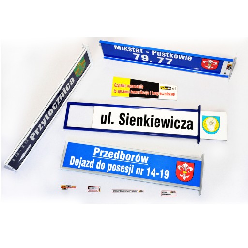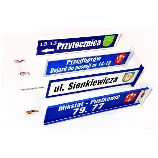 Proszę wpisać w wiadomości do sprzedającego informację o tym, co ma widnieć na tabliczce adresowej (kolor tła, kolor napisów oraz dokładny tekst + ewentualnie: logo, herb, strzałki itp.)