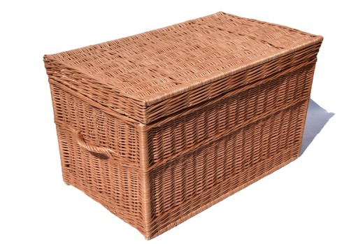 Popularny i praktyczny kufer wiklinowy/ skrzynia z płaskim wiekiem zmocowanym na solidnych zawiasach