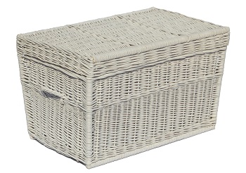 Popularny i praktyczny kufer wiklinowy/ skrzynia z płaskim wiekiem zmocowanym na solidnych zawiasach . Doskonały do przechowywania zabawek, większych i mniejszych drobiazgów czy pościeli. Kufer wykonany jest z wikliny I gatunku oraz pomalowany na kolor biały.