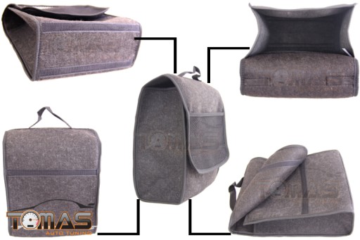 Torby do bagażnika o kolorze czarnym z czerwonymi wstawkami. Torba wykonana jest z mocnego, tapicerskiego materiału. U góry torby znajduje się mocna rączka, za którą można swobodnie przenosić kuferek oraz zamykana jest na rzep z przodu. Kuferek posiada pojemną komorę na akcesoria samochodowe, a z przodu poręczną kieszonkę na drobiazgi. Torba posiada mocne rzepy z tyłu oraz spodu kuferka zabezpieczające kuferek przed przesuwaniem się w bagażniku. Klapa zapinana na rzep. Odporna na warunki atmosferyczne.