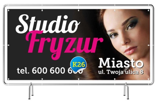 Baner reklamowy o wymiarach 2m x 1m (jesteśmy w stanie wykonać dowolny rozmiar) na materiale plandekowym wysokiej jakości.