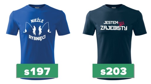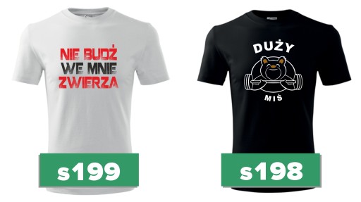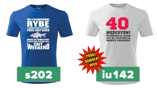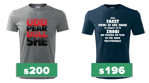 - Ustal rozmiary koszulek wg tabelki wymiarów i wybierz wzór nadruku z dostępnych na aukcji.