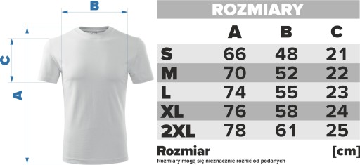 Przed złożeniem zamówienia określ prawidłowy rozmiar koszulki porównując własne wymiary z wymiarami podanymi w tabelce. Jest to bardzo istotne, ponieważ zamawiasz towar drukowany na indywidualne zamówienie, który nie podlega reklamacji z powodu niewłaściwie dobranego rozmiaru.