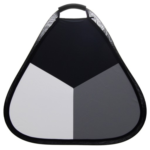 Niezwykle przydatny zestaw 4w1 w skład którego wchodzi blenda trójkątna w kolorze srebrnym oraz z drugiej strony, 3 powierzchnie (szara, czarna, biała) do ustawiana balansu bieli i ekspozycji.