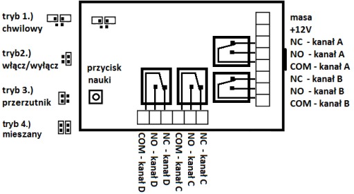 - przerzutnik - naciśnięcie przycisku na pilocie powoduje załączenie odpowiadającego mu przekaźnika i jednoczesne wyłączenie innego kanału. Kolejne naciśnięcie tego samego przycisku nic nie zmienia. W tym trybie zawsze jeden przekaźnik jest załączony. Przekaźniki „przerzucane” są jednocześnie – są od siebie zależne.
