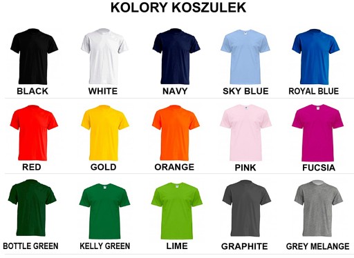 - dostępne wszystkie kolory koszulek jak w tabeli poniżej