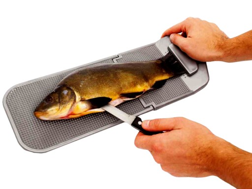 Wysokiej jakości deska do skrobania i filetowania ryb, przydatna przy oprawianiu złowionych ryb. To wyjątkowy produkt dla wędkarzy, którzy chcieliby oprawić swoją zdobycz jeszcze na łowisku, zda również egzamin w każdej kuchni czy gospodarstwie domowym. Wyposażona w klamrę zaciskową z silną sprężyną, która przytrzyma ogon każdej ryby, a antypoślizgowa powierzchnia dodatkowo zabezpieczy rybę przed przemieszczeniem. Zastosowane gumowe nóżki poprawiają stabilność deski. Nierdzewny metalowy skrobak wchodzący w skład zestawu poradzi sobie z łuską każdej ryby. Z pomocą skrobaczki szybko i bez problemów oskrobiesz złowione ryby. Wyposażona jest w ostrą tarkę. Skrobaczka bez trudu poradzi sobie z takimi rybami jak okoń i sandacz... Dzięki możliwości składania, deska zajmuje niewiele miejsca, dzięki czemu można łatwo ją przechowywać i transportować. Po zakończeniu pracy można ją umyć zarówno w zmywarce jak i pod bieżącą wodą.