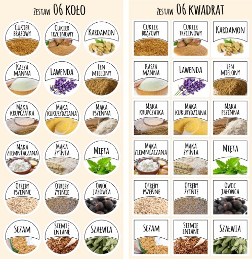 Zestaw 06: Cukier brązowy, Cukier trzcinowy, Kardamon, Kasza manna, Lawenda, Len mielony, Mąka krupczatka, Mąka kukurydziana, Mąka pszenna, Mąka ziemniaczana, Mąka żytnia, Mięta, Otręby pszenne, Otręby żytnie, Owoc jałowca, Sezam, Siemię lniane, Szałwia.
