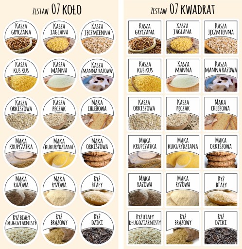 Zestaw 07: Kasza gryczana, Kasza jaglana, Kasza jęczmienna, Kasza kus kus, Kasza manna, Kasza manna razowa, Kasza orkiszowa, Kasza pęczak, Mąka chlebowa, Mąka krupczatka, Mąka kukurydziana, Mąka orkiszowa, Mąka razowa, Mąka ryżowa, Ryż biały, Ryż biały długoziarnisty, Ryż brązowy, Ryż dziki.